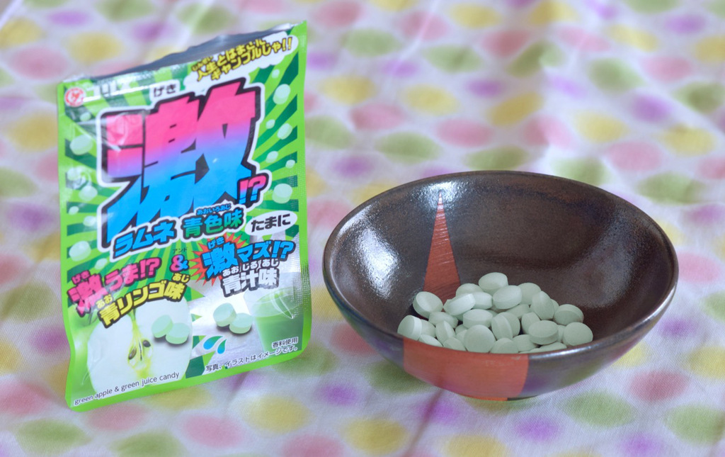 OK the real name is actually "Intense Ramune", with the following concept: all of the candies in the package look the same, but some randomly taste bad. Take turns picking one with a friend, the loser is the one who picks the bad tasting one. Here the "good taste" is apple, and the "bad taste" is vegetable juice.