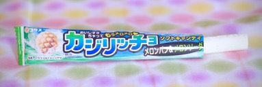 Melonpan is a type of bread in Japan, made from dough that is covered with a crisp layer of cookie dough. It's called "melonpan" because the bed resembles a melon. This chewy candy is supposed to taste like that bread, and also melon itself, as the other taste in the mixture is melon soda. This may make it the first ever melonpan product that actually tastes like melons.